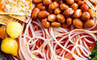 桂林米粉在米粉界得天獨厚的“霸主”地位。而桂林米粉的原主義吃法其實是干撈制法,澆頭也遠(yuǎn)沒有肥腸、排骨、魚丸這么花哨,常見的反而是鍋燒、脆皮、炸黃豆干拌,一齊混上就算大功告成?芍^人間有味是清歡。